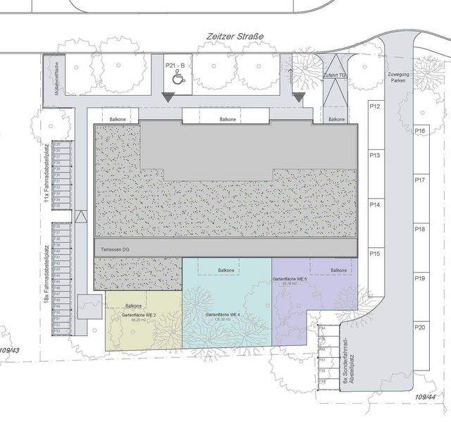 Zu den Wohnungen 2,4 und 5 gehören außerdem jeweils eigene Gartenanteile. Auf dem Grundstück finden sich Abstellmöglichkeiten für Freizeit- und Nutzfahrräder sowie die Möglichkeit zum Laden von Elektro-Bikes.