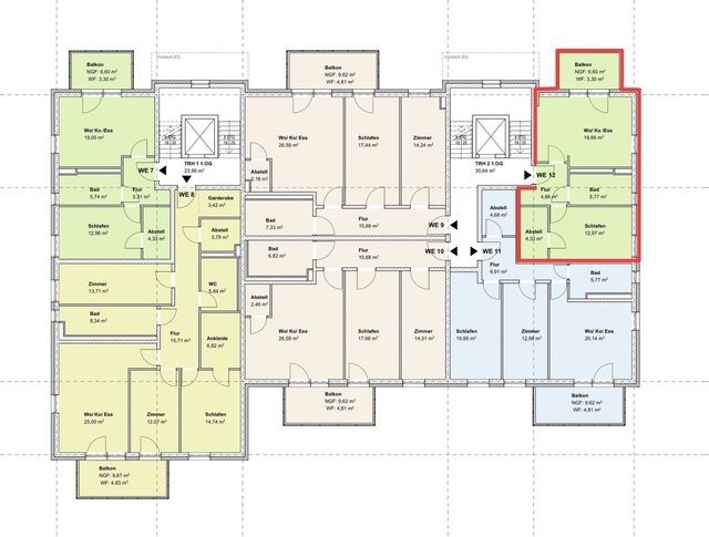 Die Eigentumswohnungen verteilen sich auf das Erdgeschoss, 1. - 3.Obergeschoss und das Dachgeschoss.